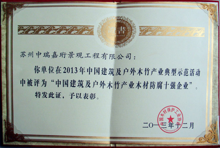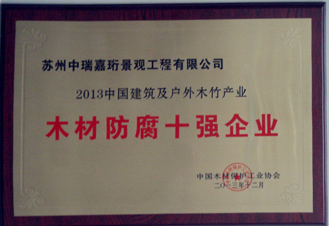 2013年在《中國(guó)木材保護(hù)工業(yè)協(xié)會(huì)》的組織下,我公司榮獲本年度防腐木企業(yè)評(píng)選《防腐木材企業(yè)十強(qiáng)》稱號(hào)。
